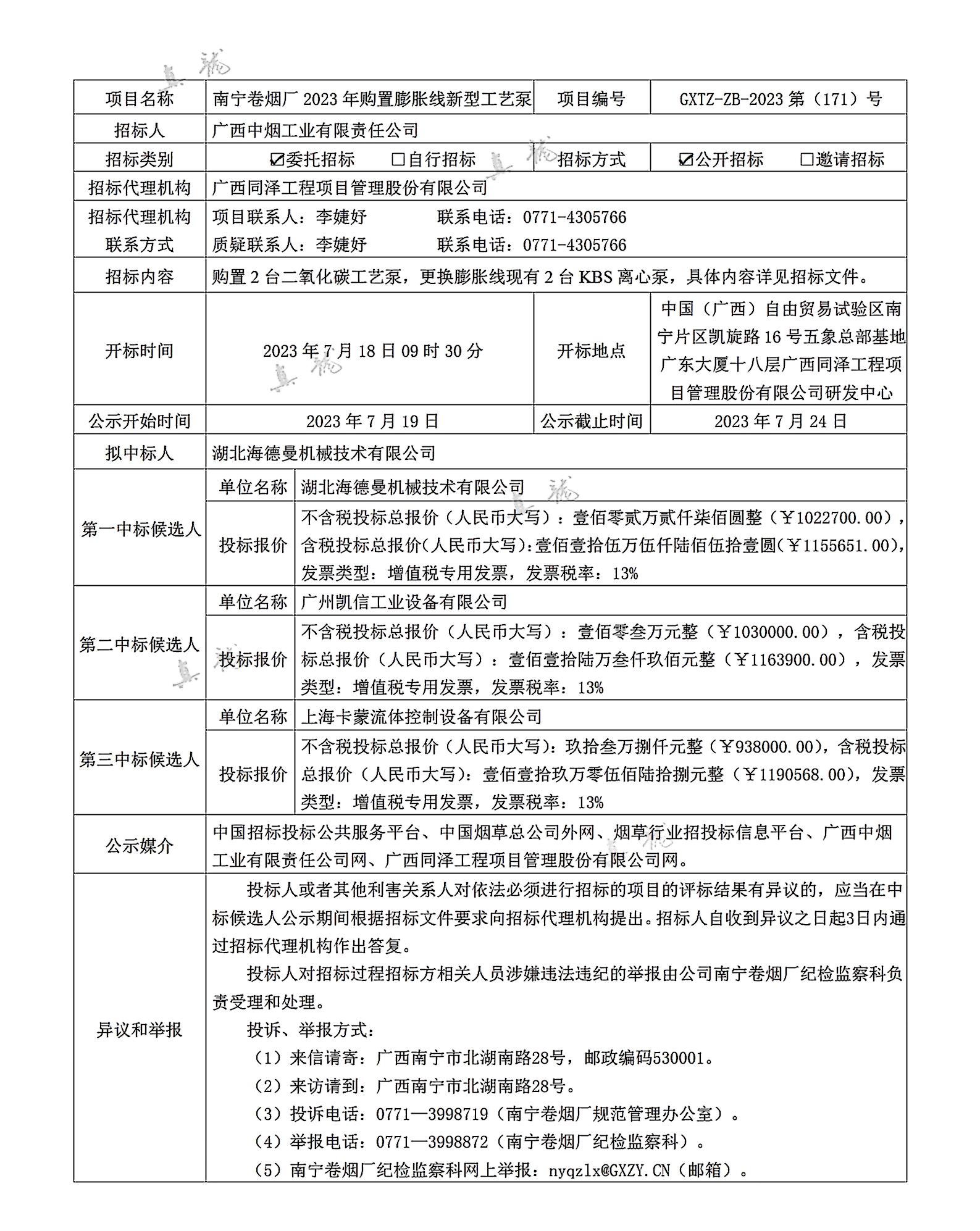 廣西中煙工業(yè)有限責(zé)任公司南寧卷煙廠2023年購(gòu)置膨脹線新型工藝泵(項(xiàng)目編號(hào):GXTZ-ZB-2023第(171)號(hào))中標(biāo)候選人公示